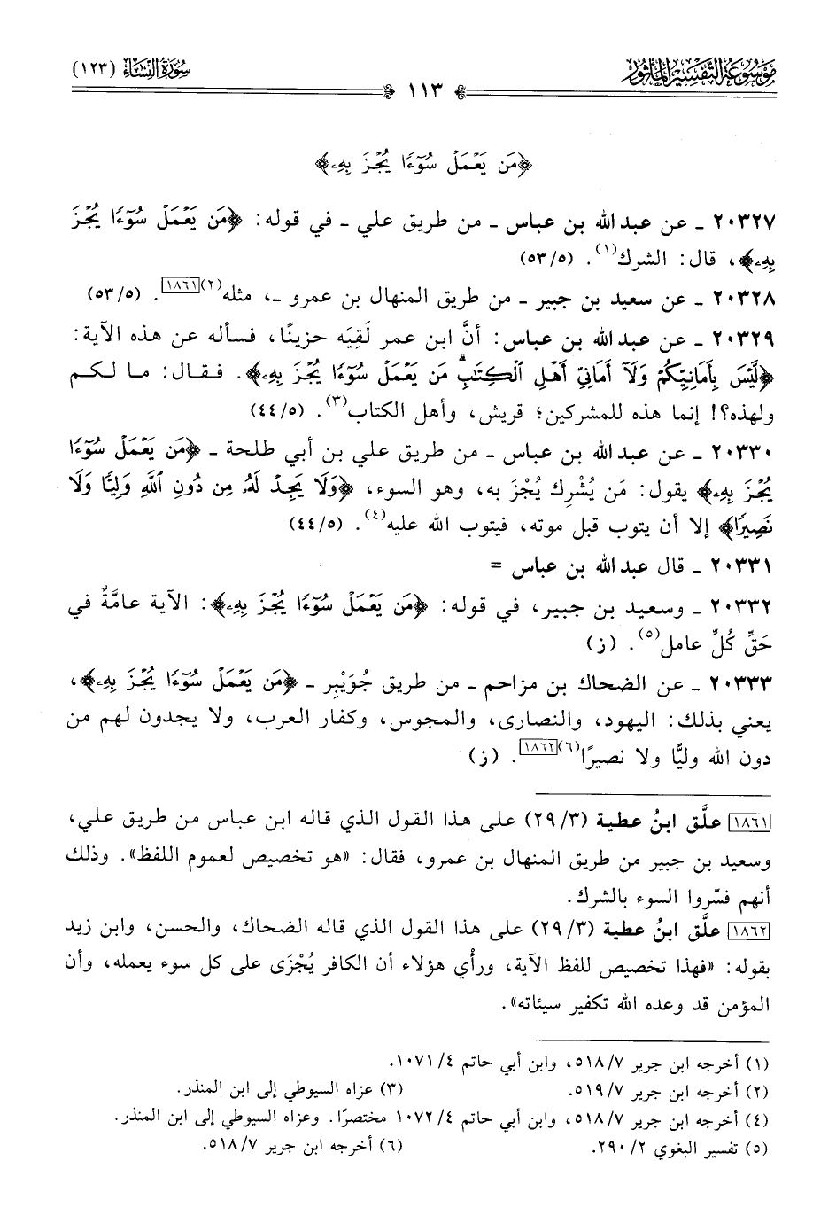 ٢٠٣٢٧ - عن عبد الله بن عباس -من طريق علي- في قوله: {من يعمل سوءا يجز به}، قال: الشرك (¬١). (٥/ ٥٣)