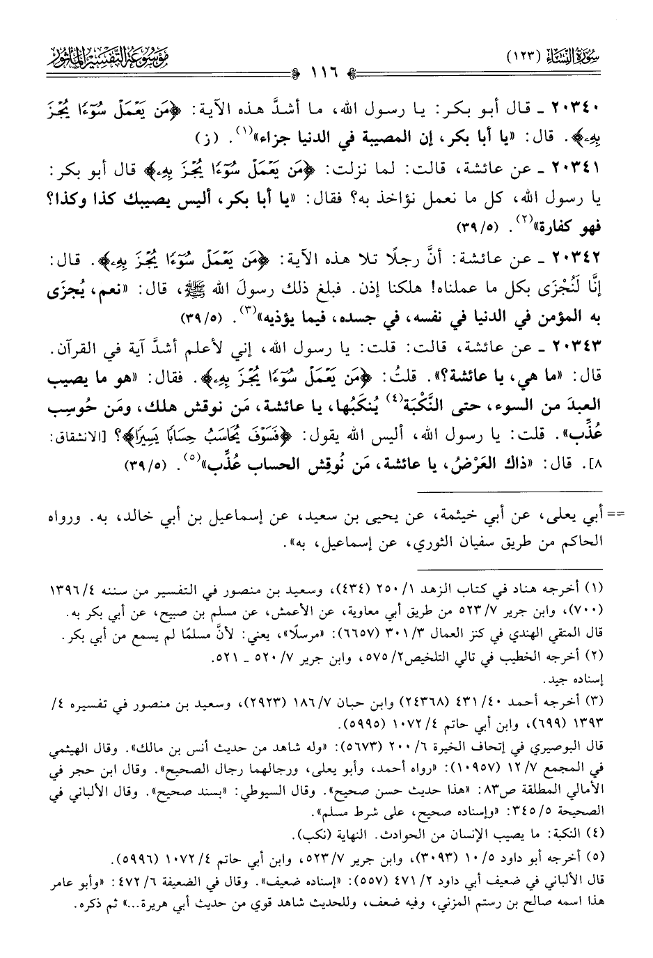 ٢٠٣٤٢ - عن عائشة: أنّ رجلًا تلا هذه الآية: {من يعمل سوءا يجز به}. قال: إنّا لَنُجْزى بكل ما عملناه! هلكنا إذن. فبلغ ذلك رسول الله - صلى الله عليه وسلم -، قال: «نعم، يُجزى به المؤمن في الدنيا في نفسه، في جسده، فيما يؤذيه» (¬٣).