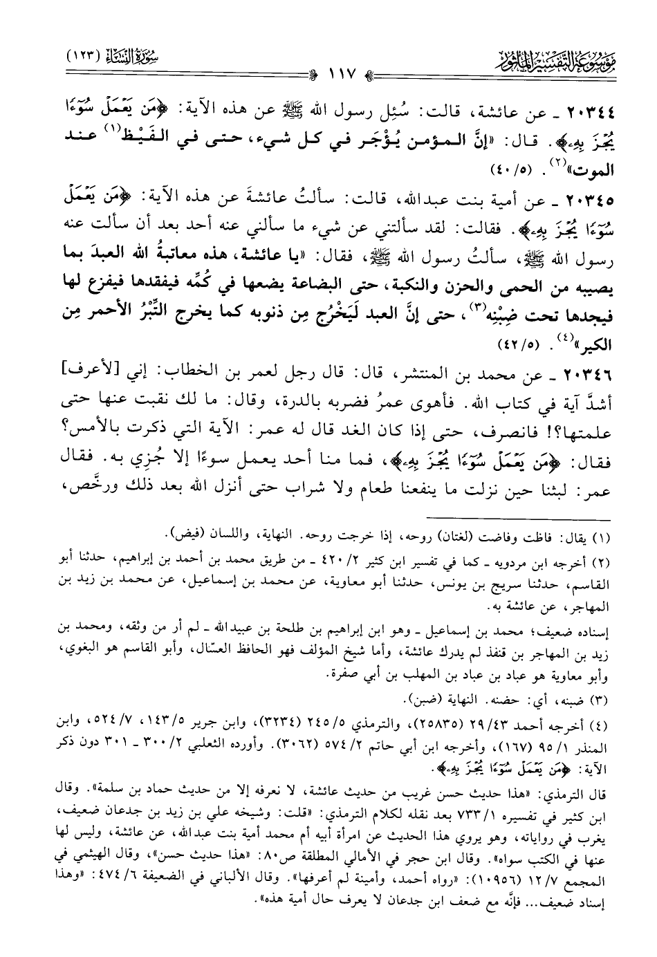 (¬٤) أخرجه أحمد ٤٣/ ٢٩ (٢٥٨٣٥)، والترمذي ٥/ ٢٤٥ (٣٢٣٤)، وابن جرير ٥/ ١٤٣، ٧/ ٥٢٤، وابن المنذر ١/ ٩٥ (١٦٧)، وأخرجه ابن أبي حاتم ٢/ ٥٧٤ (٣٠٦٢). وأورده الثعلبي ٢/ ٣٠٠ - ٣٠١ دون ذكر الآية: {ومن يعمل سوءا يجز به}.