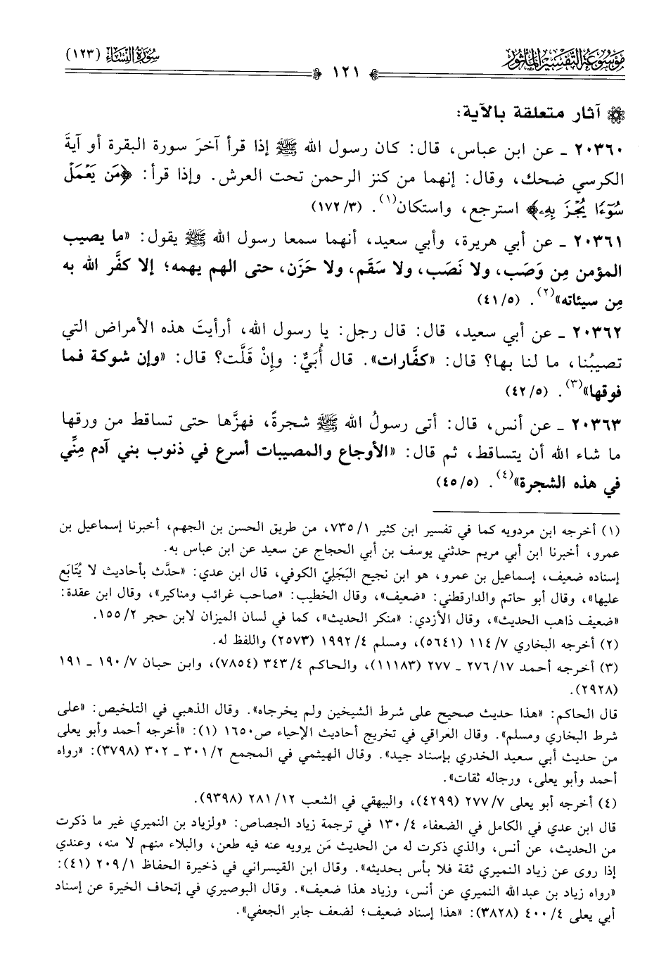 ٢٠٣٦٠ - عن ابن عباس، قال: كان رسول الله - صلى الله عليه وسلم - إذا قرأ آخرَ سورة البقرة أو آيةَ الكرسي ضحك، وقال: إنهما من كنز الرحمن تحت العرش. وإذا قرأ: {من يعمل سوءا يجز به} استرجع، واستكان (¬١). (٣/ ١٧٢)