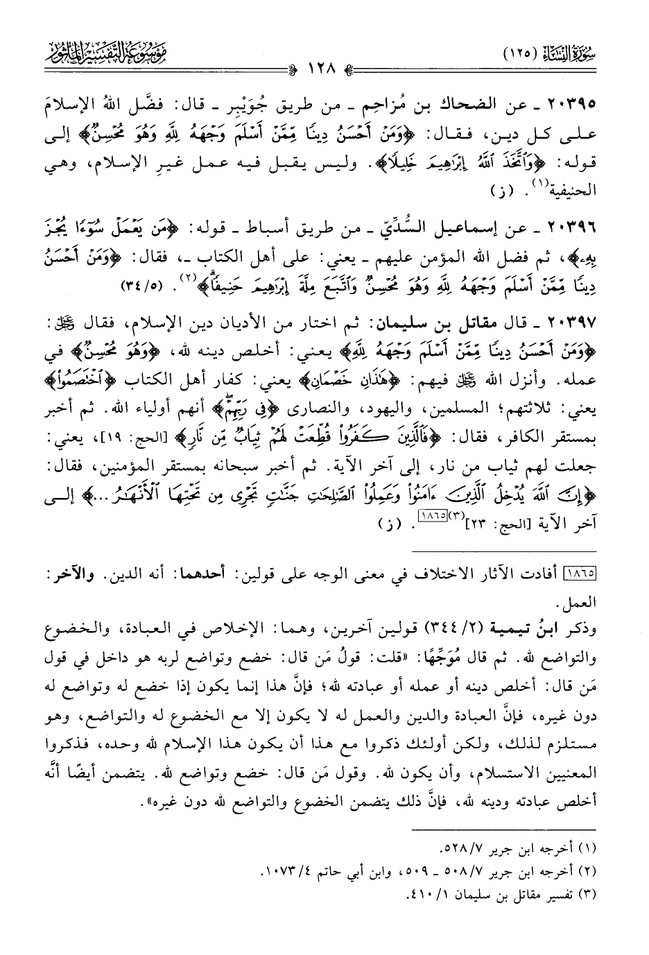 ٢٠٣٩٥ - عن الضحاك بن مُزاحِم -من طريق جُوَيْبِر- قال: فضَّل اللهُ الإسلامَ على كل دين، فقال: {ومن أحسن دينا ممن أسلم وجهه لله وهو محسن} إلى قوله: {واتخذ الله إبراهيم خليلا}. وليس يقبل فيه عمل غيرِ الإسلام، وهي الحنيفية (¬١). (ز)