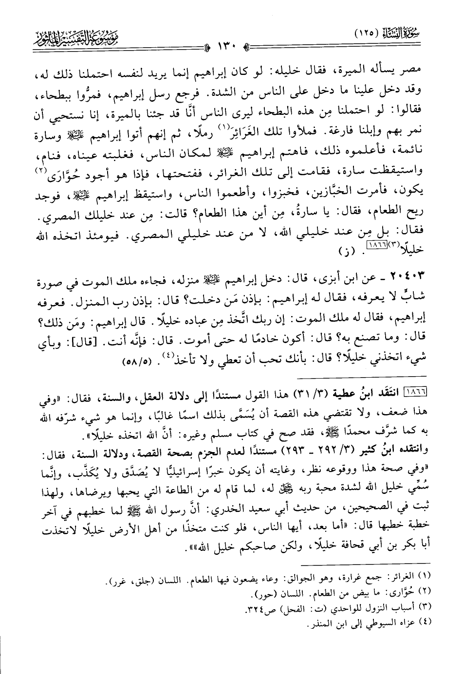 وانتقده ابنُ كثير (٣/ ٢٩٢ - ٢٩٣) مستندًا لعدم الجزم بصحة القصة، ودلالة السنة، فقال: «وفي صحة هذا ووقوعه نظر، وغايته أن يكون خبرًا إسرائيليًّا لا يُصَدَّق ولا يُكَذَّب، وإنّما سُمِّي خليل الله لشدة محبة ربه - عز وجل - له، لما قام له من الطاعة التي يحبها ويرضاها، ولهذا ثبت في الصحيحين، من حديث أبي سعيد الخدري: أنّ رسول الله - صلى الله عليه وسلم - لما خطبهم في آخر خطبة خطبها قال: «أما بعد، أيها الناس، فلو كنت متخذًا من أهل الأرض خليلًا لاتخذت أبا بكر بن أبي قحافة خليلًا، ولكن صاحبكم خليل الله»».