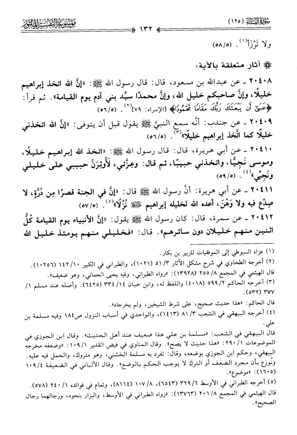 ٢٠٤٠٨ - عن عبد الله بن مسعود، قال: قال رسول الله - صلى الله عليه وسلم -: «إنّ الله اتخذ إبراهيم خليلًا، وإنّ صاحبكم خليل الله، وإنّ محمدًا سيِّد بني آدم يوم القيامة». ثم قرأ: {عسى أن يبعثك ربك مقاما محمودا} [الإسراء: ٧٩] (¬٢). (٥/ ٥٦)