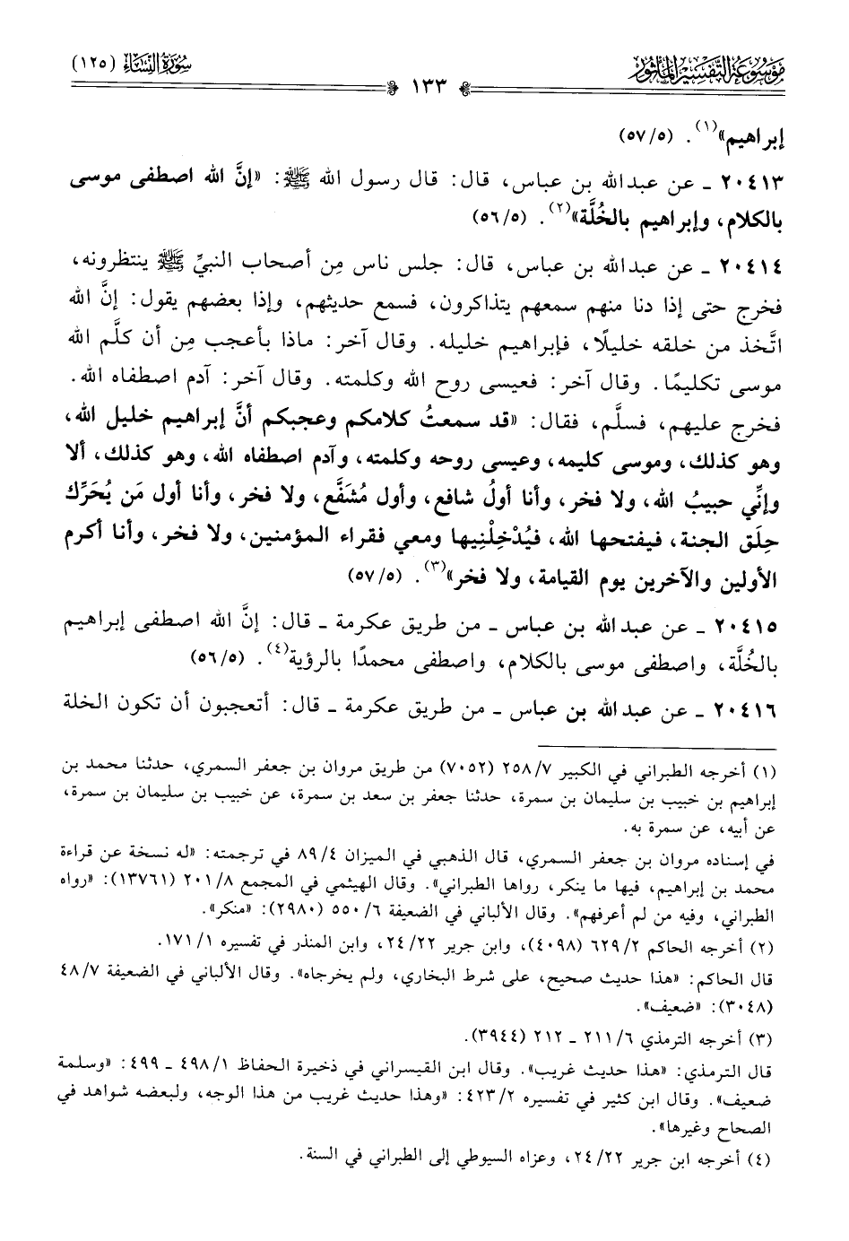٢٠٤١٥ - عن عبد الله بن عباس -من طريق عكرمة- قال: إنّ الله اصطفى إبراهيم بالخُلَّة، واصطفى موسى بالكلام، واصطفى محمدًا بالرؤية (¬٤). (٥/ ٥٦)