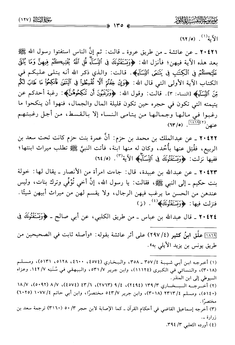 ٢٠٤٢١ - عن عائشة -من طريق عروة- قالت: ثم إنّ الناس استفتوا رسول الله - صلى الله عليه وسلم - بعد هذه الآية فيهن؛ فأنزل الله: {ويستفتونك في النساء قل الله يفتيكم فيهن وما يتلى عليكم في الكتاب في يتامى النساء}. قالت: والذي ذكر الله أنه يتلى عليكم في الكتاب الآية الأولى التي قال الله: {وإن خفتم أن لا تقسطوا في اليتامى فانكحوا ما طاب لكم من النساء} [النساء: ٣]. قالت: وقول الله: {وترغبون أن تنكحوهن}: رغبة أحدكم عن يتيمته التي تكون في حجره حين تكون قليلة المال والجمال، فنهوا أن ينكحوا ما رغبوا في مالها وجمالها من يتامى النساء إلا بالقسط، من أجل رغبتهم عنهن (¬٢) [١٨٦٩]. (٥/ ٦٣)