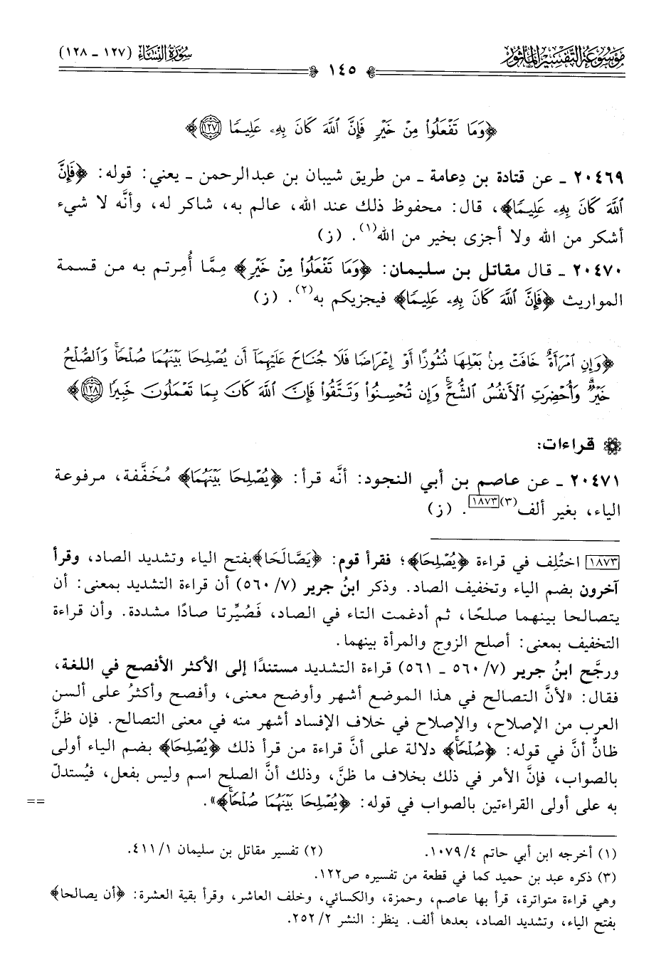 [١٨٧٣] اختُلِف في قراءة {يصلحا}؛ فقرأ قوم: «يَصّالَحا» بفتح الياء وتشديد الصاد، وقرأ آخرون بضم الياء وتخفيف الصاد. وذكر ابنُ جرير (٧/ ٥٦٠) أن قراءة التشديد بمعنى: أن يتصالحا بينهما صلحًا، ثم أدغمت التاء في الصاد، فَصُيِّرتا صادًا مشددة. وأن قراءة التخفيف بمعنى: أصلح الزوج والمرأة بينهما.