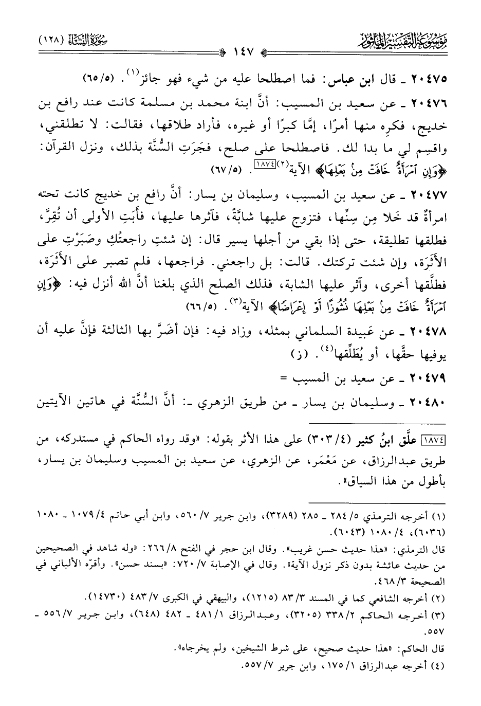 ٢٠٤٧٧ - عن سعيد بن المسيب، وسليمان بن يسار: أنّ رافع بن خديج كانت تحته امرأةٌ قد خَلا مِن سِنِّها، فتزوج عليها شابَّةً، فآثرها عليها، فأَبَتِ الأولى أن تُقِرَّ، فطلقها تطليقة، حتى إذا بقي من أجلها يسير قال: إن شئتِ راجعتُكِ وصَبَرْتِ على الأَثَرَة، وإن شئت تركتك. قالت: بل راجعني. فراجعها، فلم تصبر على الأَثَرَة، فطلَّقها أخرى، وآثر عليها الشابة، فذلك الصلح الذي بلغنا أنّ الله أنزل فيه: {وإن امرأة خافت من بعلها نشوزا أو إعراضا} الآية (¬٣). (٥/ ٦٦)