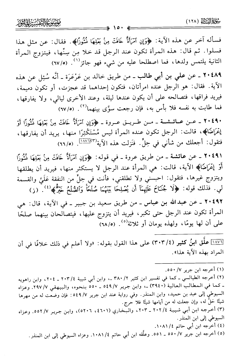 ٢٠٤٩٠ - عن عائشة -من طريق عروة- {وإن امرأة خافت من بعلها نشوزا أو إعراضا}، قالت: الرجل تكون عنده المرأة ليس مُسْتَكْثِرًا منها، يريد أن يفارقها، فتقول: أجعلك من شأني في حِلٍّ. فنَزلت هذه الآية (¬٣) [١٨٧٦]. (٥/ ٦٦)