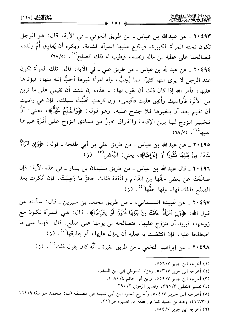 ٢٠٤٩٣ - عن عبد الله بن عباس -من طريق العوفي- في الآية، قال: هو الرجل تكون تحته المرأة الكبيرة، فينكح عليها المرأة الشابة، ويكره أن يُفارِق أُمَّ ولده، فيصالحها على عطية من ماله ونفسه، فيطيب له ذلك الصلح (¬١). (٥/ ٦٨)