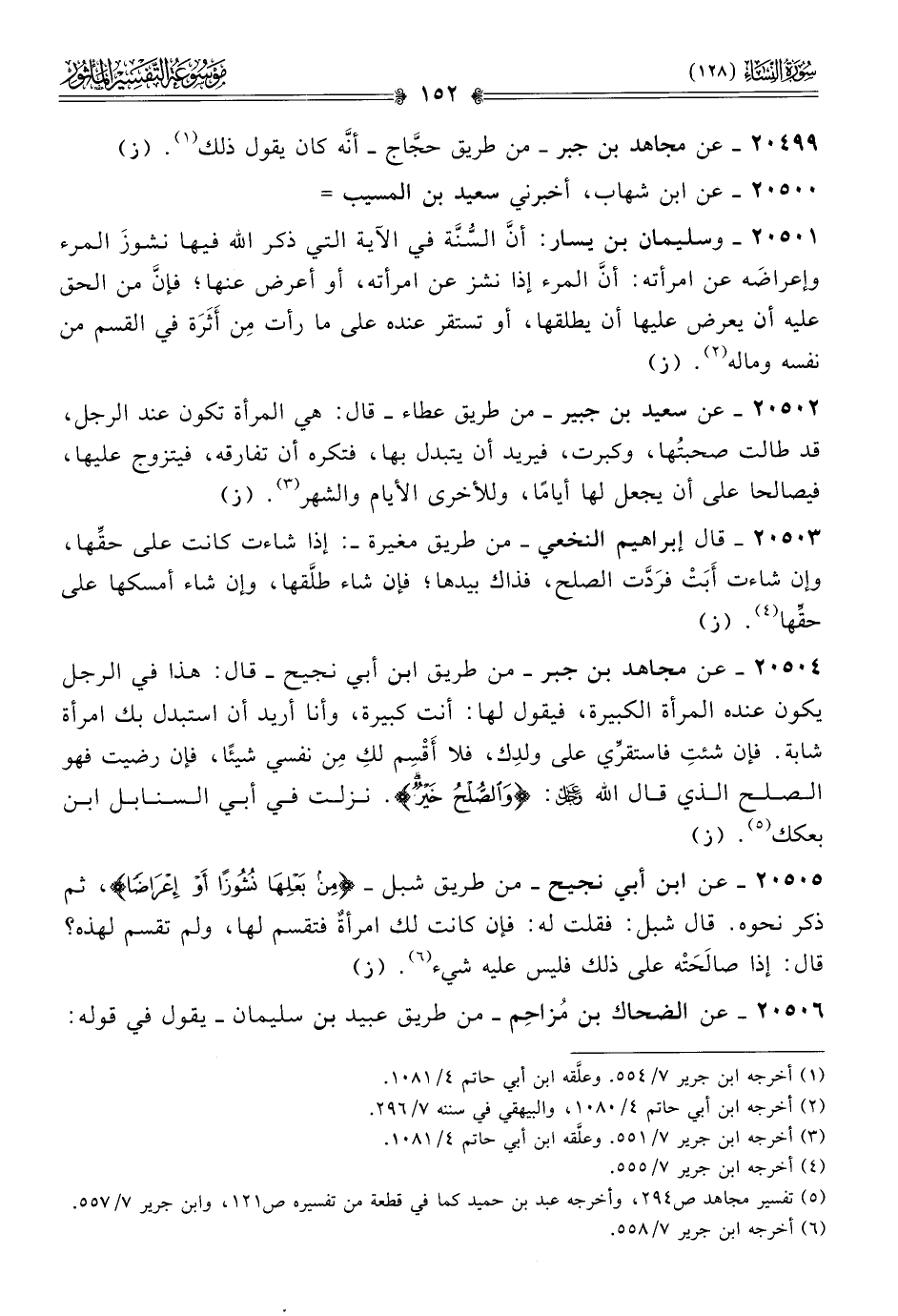 ٢٠٥٠٤ - عن مجاهد بن جبر -من طريق ابن أبي نجيح- قال: هذا في الرجل يكون عنده المرأة الكبيرة، فيقول لها: أنت كبيرة، وأنا أريد أن استبدل بك امرأة شابة. فإن شئتِ فاستقرِّي على ولدِك، فلا أقْسِم لكِ مِن نفسي شيئًا، فإن رضيت فهو الصلح الذي قال الله - عز وجل -: {والصلح خير}. نزلت في أبي السنابل ابن بعكك (¬٥). (ز)