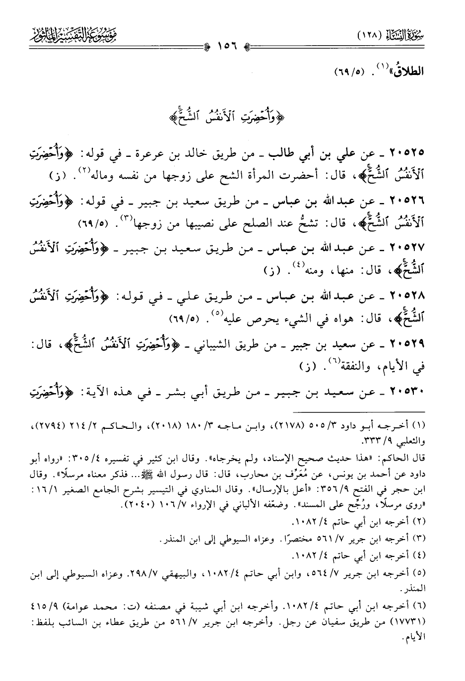 ٢٠٥٢٦ - عن عبد الله بن عباس -من طريق سعيد بن جبير- في قوله: {وأحضرت الأنفس الشح}، قال: تشحُّ عند الصلح على نصيبها من زوجها (¬٣). (٥/ ٦٩)