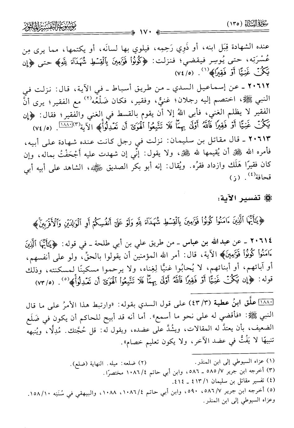 ٢٠٦١٢ - عن إسماعيل السدي -من طريق أسباط- في الآية، قال: نزلت في النبي - صلى الله عليه وسلم -، اختصم إليه رجلان؛ غنيٌّ، وفقير، فكان ضَلْعُه (¬٢) مع الفقير؛ يرى أنّ الفقير لا يظلم الغني، فأبى اللهُ إلا أن يقوم بالقسط في الغني والفقير؛ فقال: {إن يكن غنيا أو فقيرا فالله أولى بهما فلا تتبعوا الهوى أن تعدلوا} الآية (¬٣) [١٨٨٠]. (٥/ ٧٤)