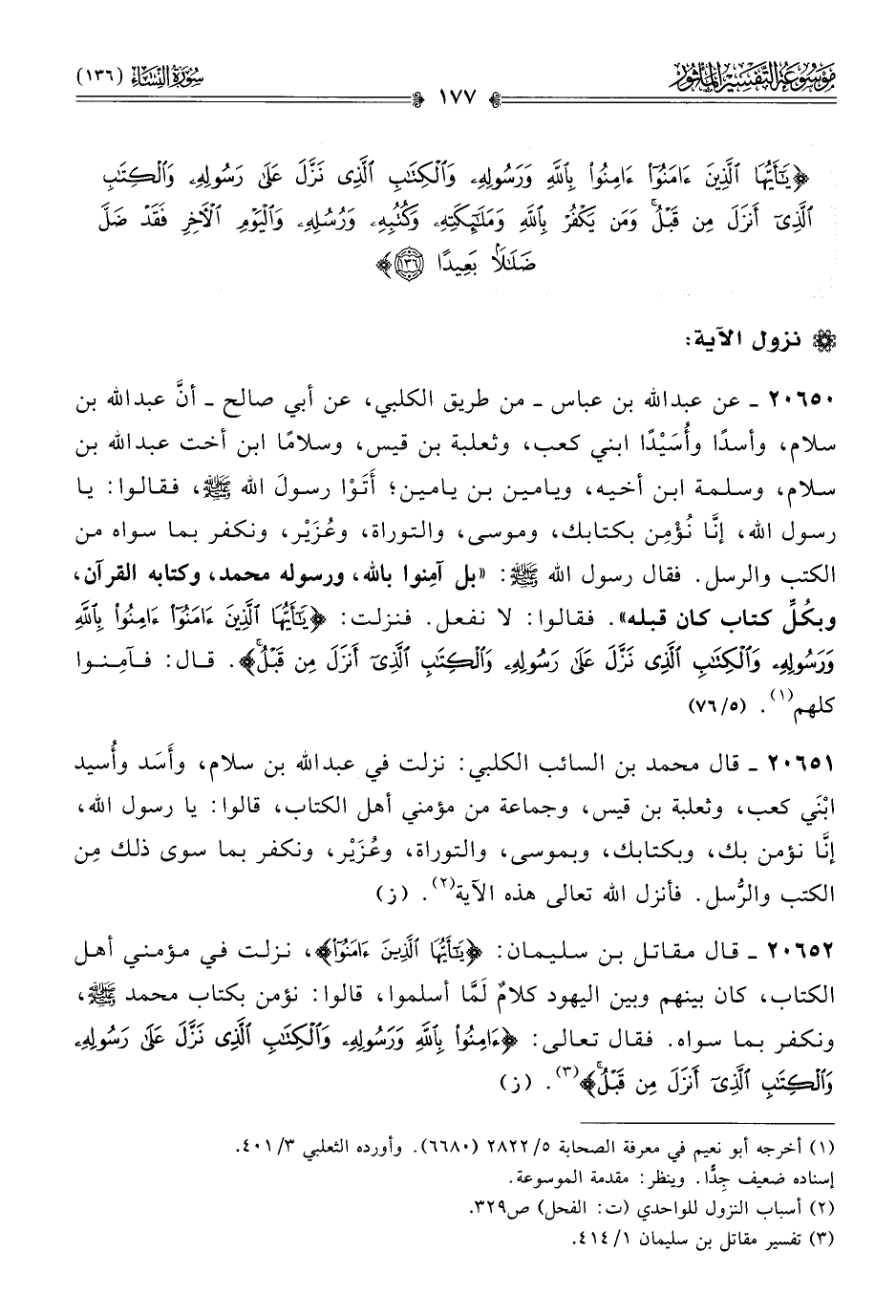 ٢٠٦٥٠ - عن عبد الله بن عباس -من طريق الكلبي، عن أبي صالح- أنّ عبد الله بن سلام، وأسدًا وأُسَيْدًا ابني كعب، وثعلبة بن قيس، وسلامًا ابن أخت عبد الله بن سلام، وسلمة ابن أخيه، ويامين بن يامين؛ أتَوْا رسول الله - صلى الله عليه وسلم -، فقالوا: يا رسول الله، إنّا نُؤْمِن بكتابك، وموسى، والتوراة، وعُزَيْر، ونكفر بما سواه من الكتب والرسل. فقال رسول الله - صلى الله عليه وسلم -: «بل آمِنوا بالله، ورسوله محمد، وكتابه القرآن، وبكُلِّ كتاب كان قبله». فقالوا: لا نفعل. فنزلت: {يا أيها الذين ءامنوا ءامنوا بالله ورسوله والكتاب الذي نزل على رسوله والكتاب الذي أنزل من قبل}. قال: فآمِنوا كلهم (¬١). (٥/ ٧٦)