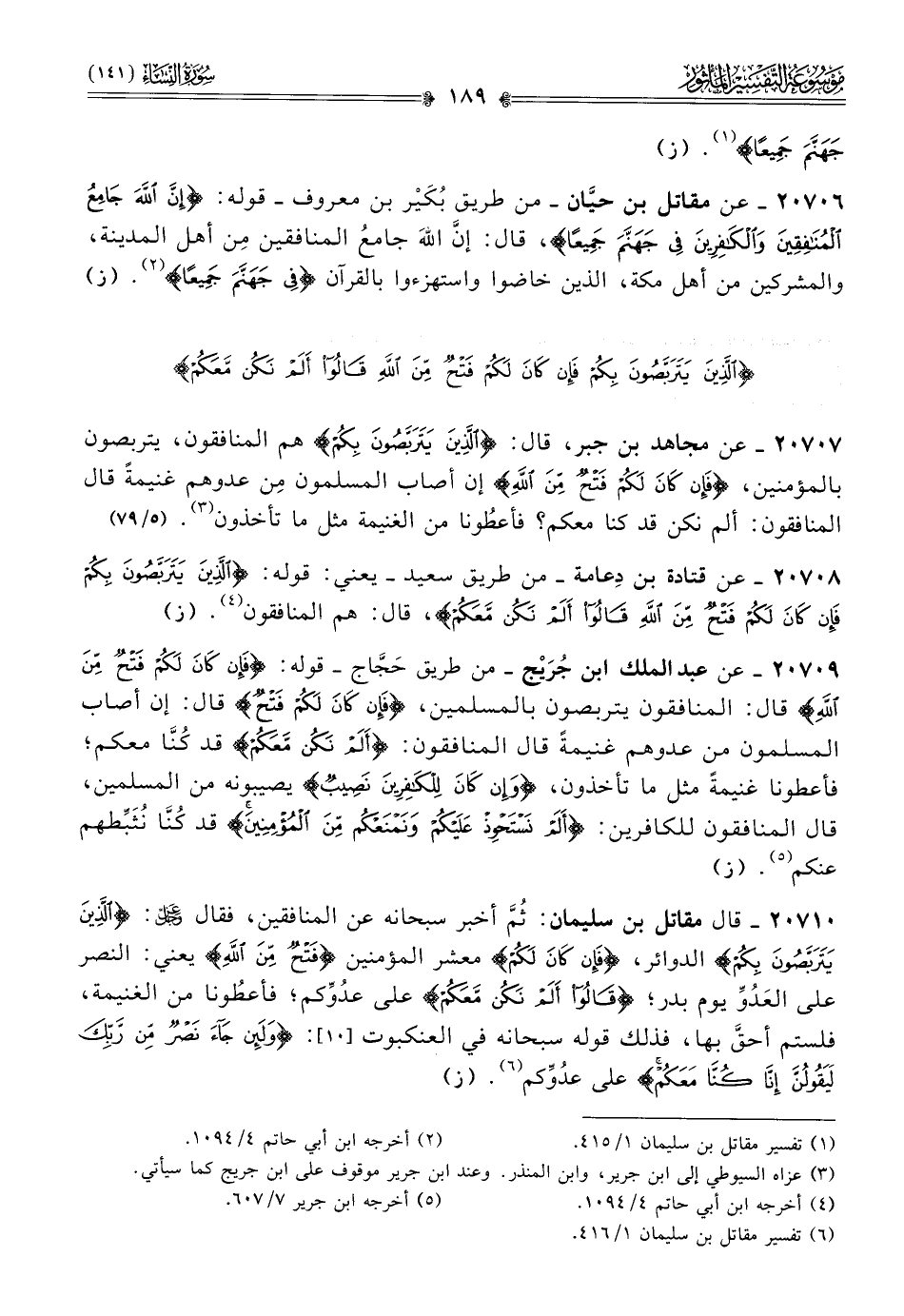٢٠٧٠٧ - عن مجاهد بن جبر، قال: {الذين يتربصون بكم} هم المنافقون، يتربصون بالمؤمنين، {فإن كان لكم فتح من الله} إن أصاب المسلمون مِن عدوهم غنيمةً قال المنافقون: ألم نكن قد كنا معكم؟ فأعطُونا من الغنيمة مثل ما تأخذون (¬٣). (٥/ ٧٩)