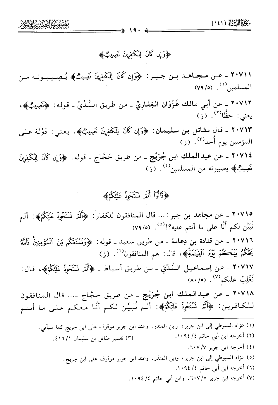 ٢٠٧١٥ - عن مجاهد بن جبر: ... قال المنافقون للكفار: {ألم نستحوذ عليكم}: ألم نبين لكم أنّا على ما أنتم عليه؟! (¬٥). (٥/ ٧٩)