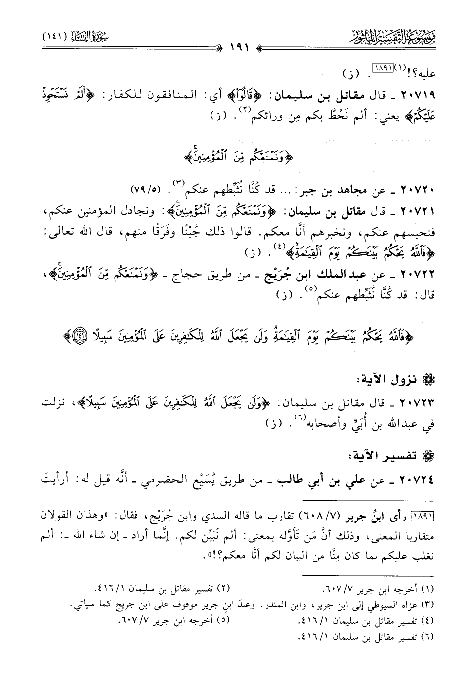 ٢٠٧٢٣ - قال مقاتل بن سليمان: {ولن يجعل الله للكافرين على المؤمنين سبيلا}، نزلت في عبد الله بن أُبَيٍّ وأصحابه (¬٦). (ز)