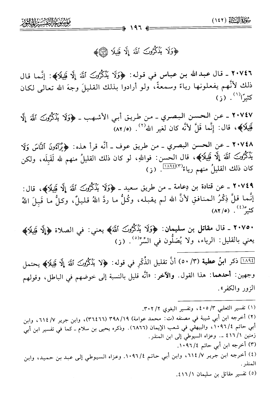 ٢٠٧٤٦ - قال عبد الله بن عباس في قوله: {ولا يذكرون الله إلا قليلا}: إنّما قال ذلك لأنّهم يفعلونها رياءً وسمعةً، ولو أرادوا بذلك القليلَ وجهَ الله تعالى لكان كثيرًا (¬١). (ز)