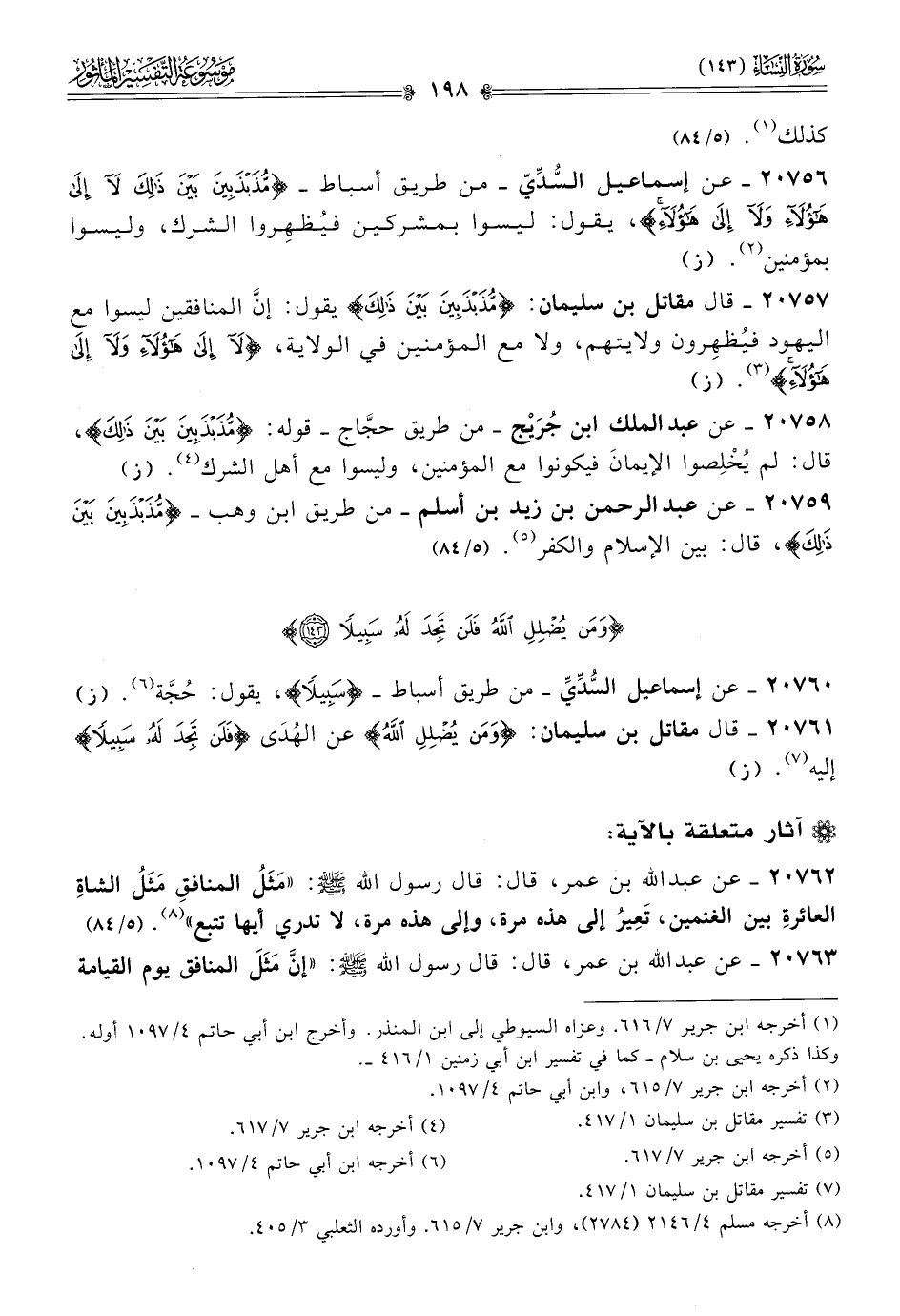 ٢٠٧٥٩ - عن عبد الرحمن بن زيد بن أسلم -من طريق ابن وهب- {مذبذبين بين ذلك}، قال: بين الإسلام والكفر (¬٥).