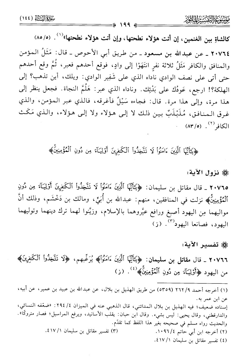٢٠٧٦٥ - قال مقاتل بن سليمان: {يا أيها الذين آمنوا لا تتخذوا الكافرين أولياء من دون المؤمنين} نزلت في المنافقين، منهم: عبدالله بن أُبَيٍّ، ومالك بن دَخْشَم، وذلك أنّ مواليهما مِن اليهود أصبغ ورافع عيَّروهما بالإسلام، وزيَّنوا لهما ترك دينهما وتوليهما اليهود، فصانعا اليهود (¬٣). (ز)