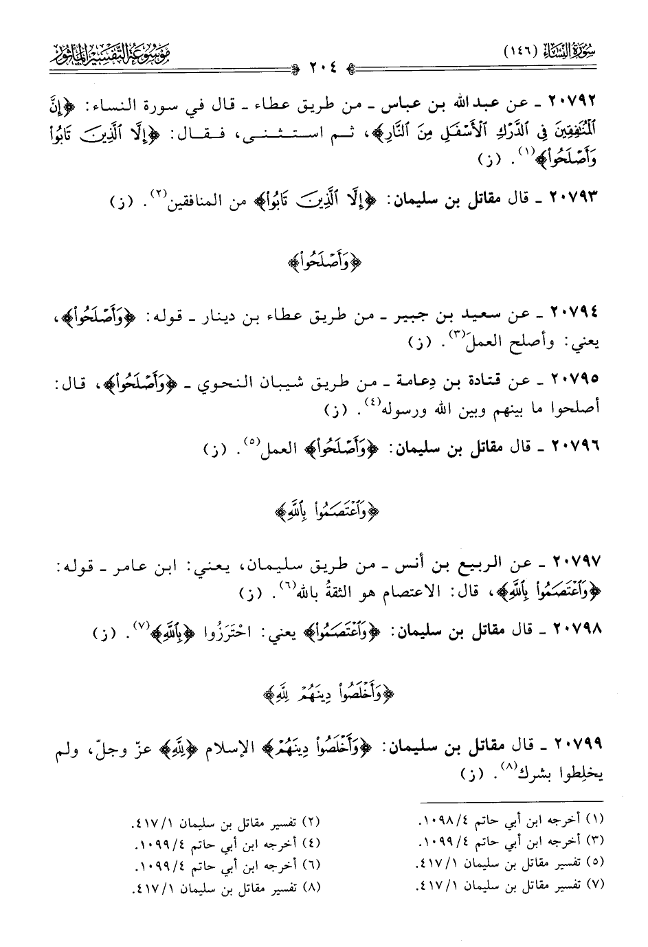 ٢٠٧٩٢ - عن عبد الله بن عباس -من طريق عطاء- قال في سورة النساء: {إن المنافقين في الدرك الأسفل من النار}، ثم استثنى، فقال: {إلا الذين تابوا وأصلحوا} (¬١). (ز)