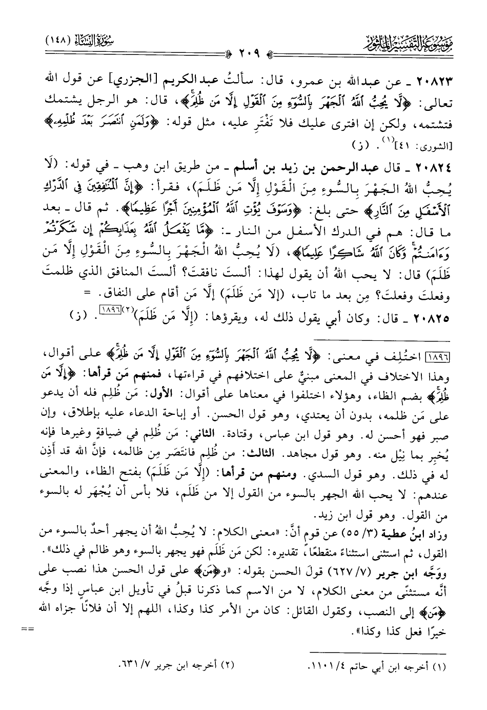 ٢٠٨٢٣ - عن عبد الله بن عمرو، قال: سألتُ عبد الكريم [الجزري] عن قول الله تعالى: {لا يحب الله الجهر بالسوء من القول إلا من ظلم}، قال: هو الرجل يشتمك فتشتمه، ولكن إن افترى عليك فلا تَفْتَرِ عليه، مثل قوله: {ولمن انتصر بعد ظلمه} [الشورى: ٤١] (¬١). (ز)