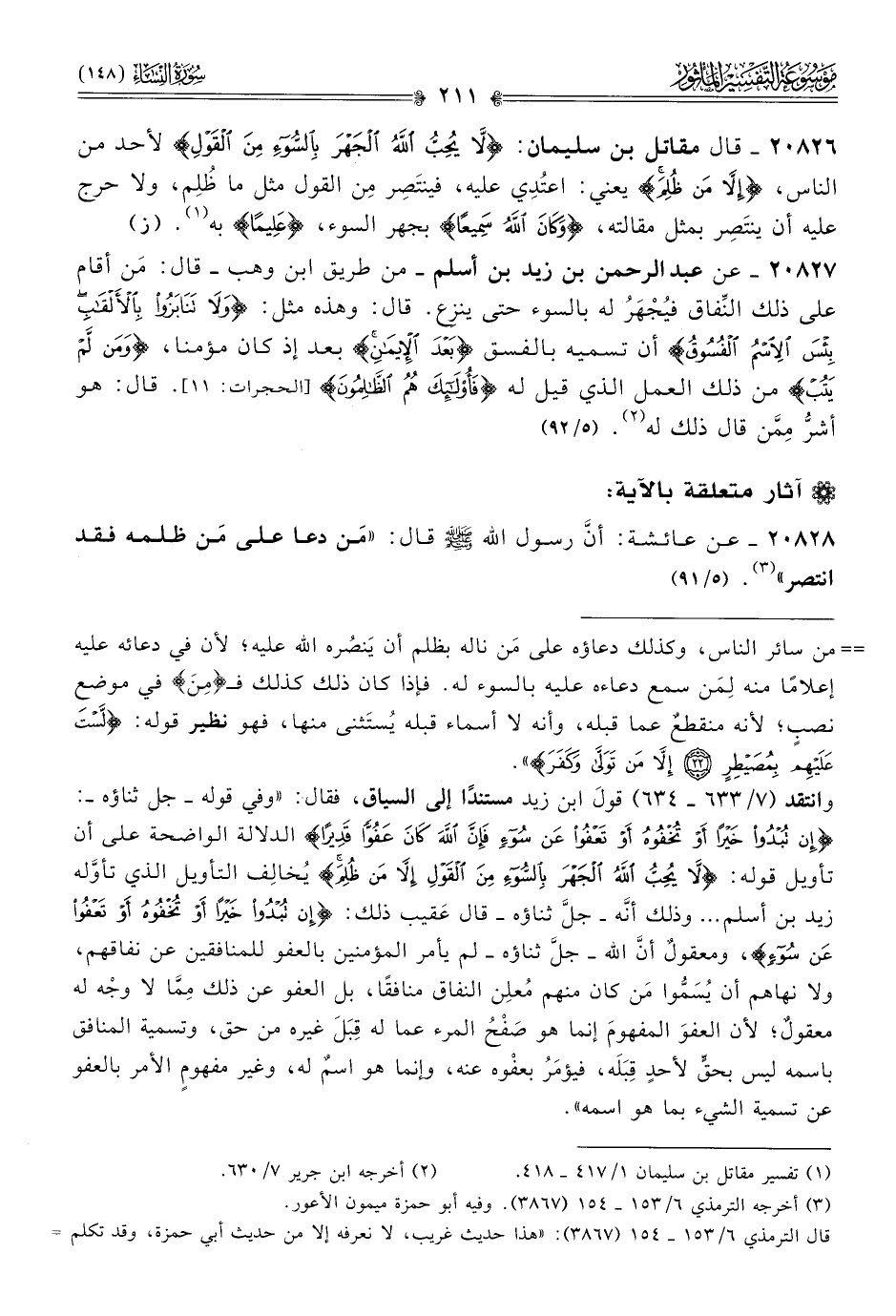 ٢٠٨٢٦ - قال مقاتل بن سليمان: {لا يحب الله الجهر بالسواء من القول} لأحد من الناس، {إلا من ظلم} يعني: اعتُدِي عليه، فينتَصِر مِن القول مثل ما ظُلِم، ولا حرج عليه أن ينتَصِر بمثل مقالته، {وكان الله سميعًا} بجهر السوء، {عليما} به (¬١). (ز)