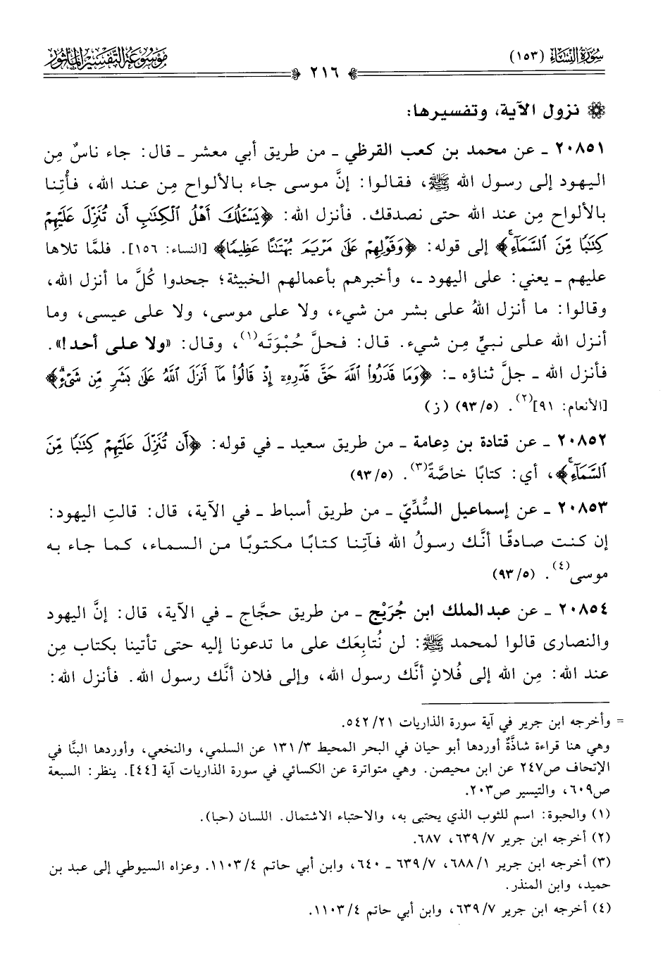 ٢٠٨٥٣ - عن إسماعيل السُّدِّيّ -من طريق أسباط- في الآية، قال: قالتِ اليهود: إن كنت صادقًا أنّك رسول الله فآتِنا كتابًا مكتوبًا من السماء، كما جاء به موسى (¬٤). (٥/ ٩٣)