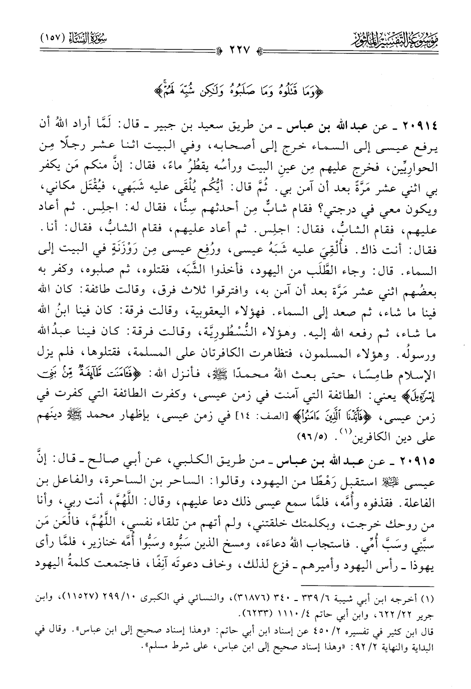 ٢٠٩١٤ - عن عبد الله بن عباس -من طريق سعيد بن جبير- قال: لَمّا أراد اللهُ أن يرفع عيسى إلى السماء خرج إلى أصحابه، وفي البيت اثنا عشر رجلًا مِن الحوارِيِّين، فخرج عليهم مِن عينِ البيت ورأسُه يقطُرُ ماءً، فقال: إنّ منكم مَن يكفر بي اثني عشر مَرَّةً بعد أن آمن بي. ثُمَّ قال: أيُّكُم يُلْقى عليه شَبَهي، فيُقْتَل مكاني، ويكون معي في درجتي؟ فقام شابٌّ مِن أحدثهم سِنًّا، فقال له: اجلِس. ثم أعاد عليهم، فقام الشابُّ، فقال: اجلِس. ثم أعاد عليهم، فقام الشابُّ، فقال: أنا. فقال: أنت ذاك. فأُلْقِيَ عليه شَبَهُ عيسى، ورُفِع عيسى مِن رَوْزَنَةٍ في البيت إلى السماء. قال: وجاء الطَّلَب من اليهود، فأخذوا الشَّبَه، فقتلوه، ثم صلبوه، وكفر به بعضُهم اثني عشر مَرَّة بعد أن آمن به، وافترقوا ثلاث فرق، وقالت طائفة: كان الله فينا ما شاء، ثم صعد إلى السماء. فهؤلاء اليعقوبية، وقالت فرقة: كان فينا ابنُ الله ما شاء، ثم رفعه الله إليه. وهؤلاء النُّسْطُورِيَّة، وقالت فرقة: كان فينا عبدُ الله ورسوله. وهؤلاء المسلمون، فتظاهرت الكافرتان على المسلمة، فقتلوها، فلم يزل الإسلام طامِسًا، حتى بعث اللهُ محمدّا - صلى الله عليه وسلم -، فأنزل الله: {فآمنت طائفة من بني إسرائيل} يعني: الطائفة التي آمنت في زمن عيسى، وكفرت الطائفة التي كفرت في زمن عيسى، {فأيدنا الذين ءامنوا} في زمن عيسى، بإظهار محمد - صلى الله عليه وسلم - دينَهم على دين الكافرين (¬١). (٥/ ٩٦)