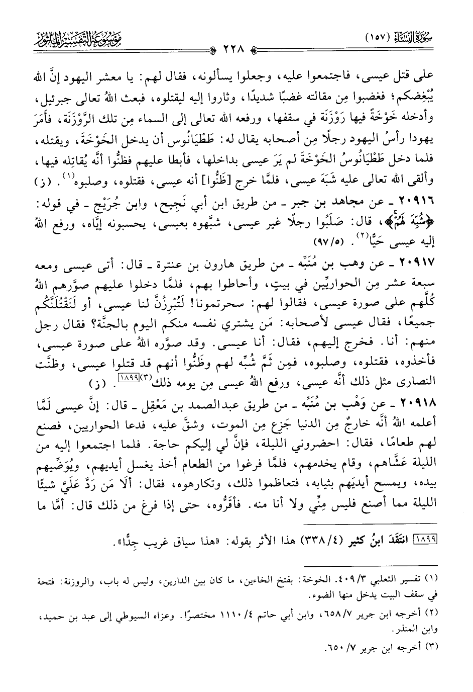٢٠٩١٧ - عن وهب بن مُنَبِّه -من طريق هارون بن عنترة- قال: أتى عيسى ومعه سبعة عشر مِن الحواريِّين في بيتٍ، وأحاطوا بهم، فلمّا دخلوا عليهم صوَّرهم اللهُ كُلَّهم على صورة عيسى، فقالوا لهم: سحرتمونا! لَتُبْرِزُنَّ لنا عيسى، أو لَنَقْتُلَنَّكُم جميعًا، فقال عيسى لأصحابه: مَن يشتري نفسه منكم اليوم بالجنَّة؟ فقال رجل منهم: أنا. فخرج إليهم، فقال: أنا عيسى. وقد صوَّره اللهُ على صورة عيسى، فأخذوه، فقتلوه، وصلبوه، فمِن ثَمَّ شُبِّه لهم وظَنُّوا أنهم قد قتلوا عيسى، وظنَّت النصارى مثل ذلك أنّه عيسى، ورفع اللهُ عيسى مِن يومه ذلك (¬٣) [١٨٩٩]. (ز)