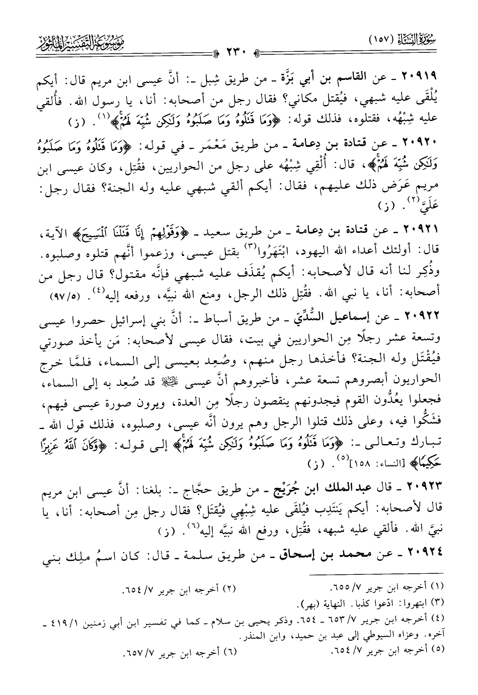 ٢٠٩٢١ - عن قتادة بن دِعامة -من طريق سعيد- {وقولهم إنا قتلنا المسيح} الآية، قال: أولئك أعداء الله اليهود، ابْتَهَرُوا (¬٣) بقتل عيسى، وزعموا أنّهم قتلوه وصلبوه. وذُكِر لنا أنه قال لأصحابه: أيكم يُقذَف عليه شبهي فإنّه مقتول؟ قال رجل من أصحابه: أنا، يا نبي الله. فقُتِل ذلك الرجل، ومنع الله نبيه، ورفعه إليه (¬٤). (٥/ ٩٧)