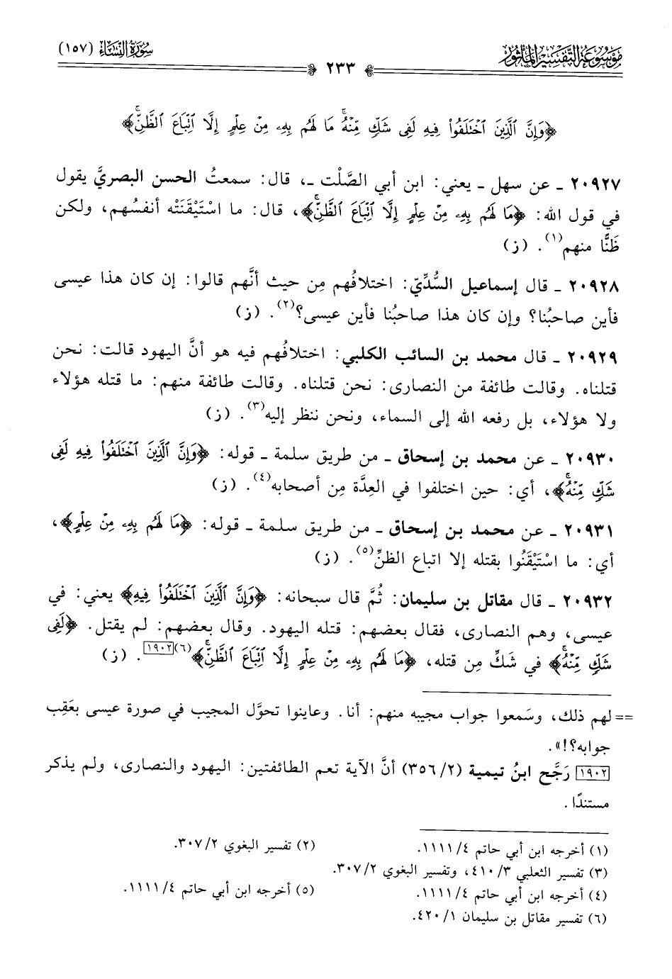 ٢٠٩٣٢ - قال مقاتل بن سليمان: ثُمَّ قال سبحانه: {وإن الذين اختلفوا فيه} يعني: في عيسى، وهم النصارى، فقال بعضهم: قتله اليهود. وقال بعضهم: لم يقتل. {لفي شك منه} في شَكِّ مِن قتله، {ما لهم به من علم إلا اتباع الظن} (¬٦) [١٩٠٢]. (ز)