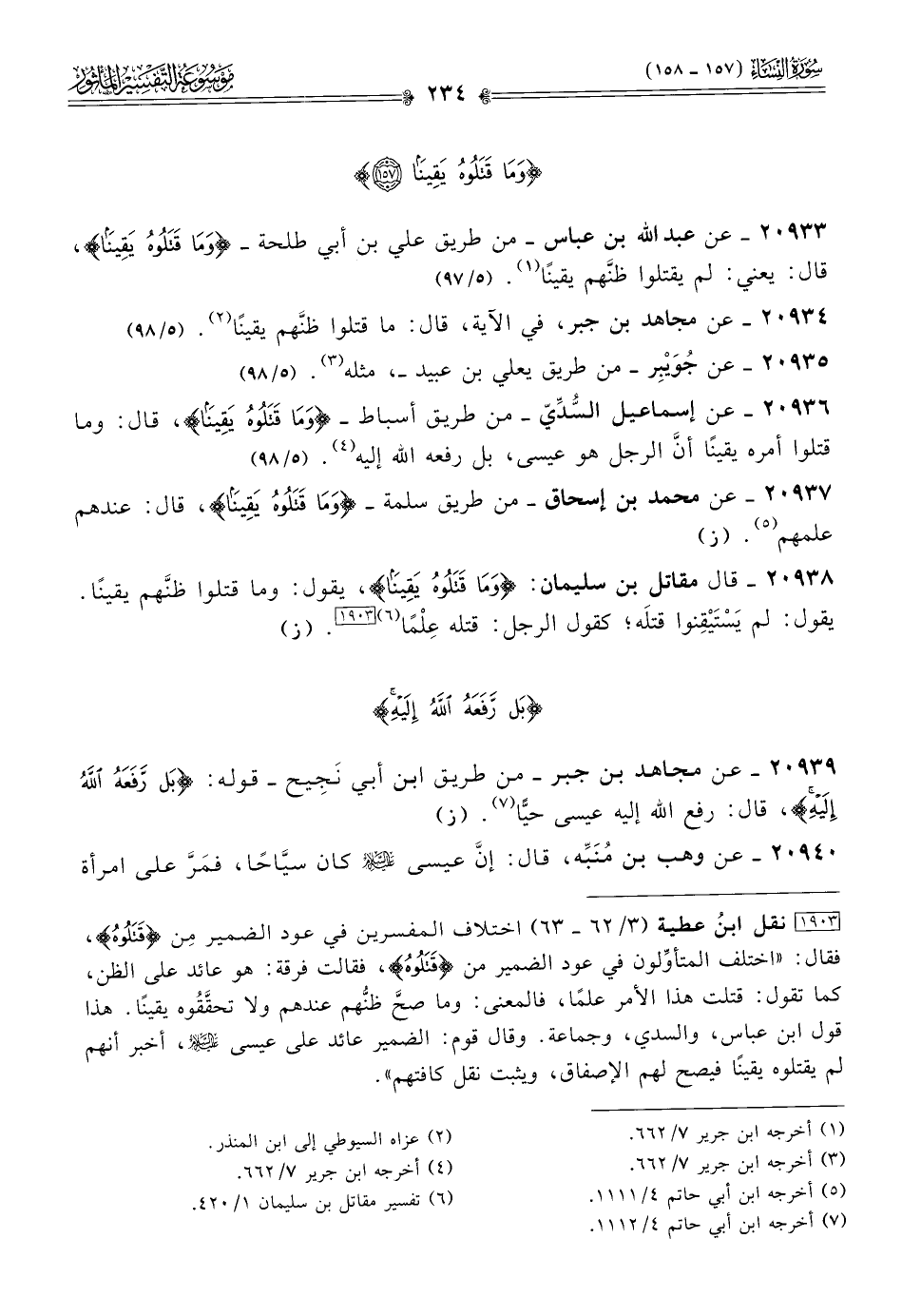 ٢٠٩٣٦ - عن إسماعيل السُّدِّيّ -من طريق أسباط- {وما قتلوه يقينا}، قال: وما قتلوا أمره يقينًا أنّ الرجل هو عيسى، بل رفعه الله إليه (¬٤). (٥/ ٩٨)