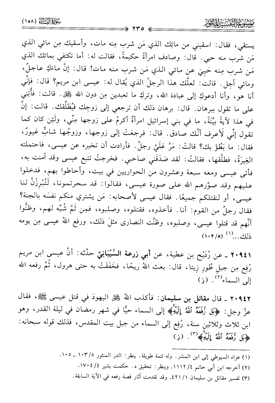 ٢٠٩٤٢ - قال مقاتل بن سليمان: فأكذب اللهُ - عز وجل - اليهودَ في قتل عيسى - صلى الله عليه وسلم -، فقال - عز وجل -: {بل رفعه الله إليه} إلى السماء حيًّا في شهر رمضان في ليلة القدر، وهو ابن ثلاث وثلاثين سنة، رُفِع إلى السماء من جبل بيت المقدس، فذلك قوله سبحانه: {بل رفعه الله إليه} (¬٣). (ز)