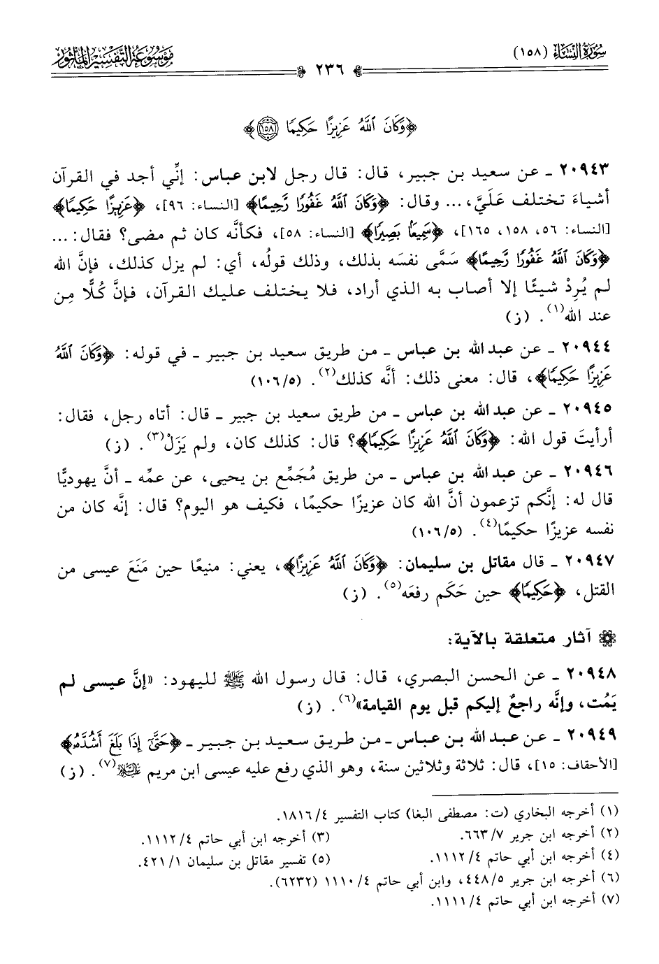 ٢٠٩٤٤ - عن عبد الله بن عباس -من طريق سعيد بن جبير- في قوله: {وكان الله عزيزا حكيما}، قال: معنى ذلك: أنّه كذلك (¬٢). (٥/ ١٠٦)