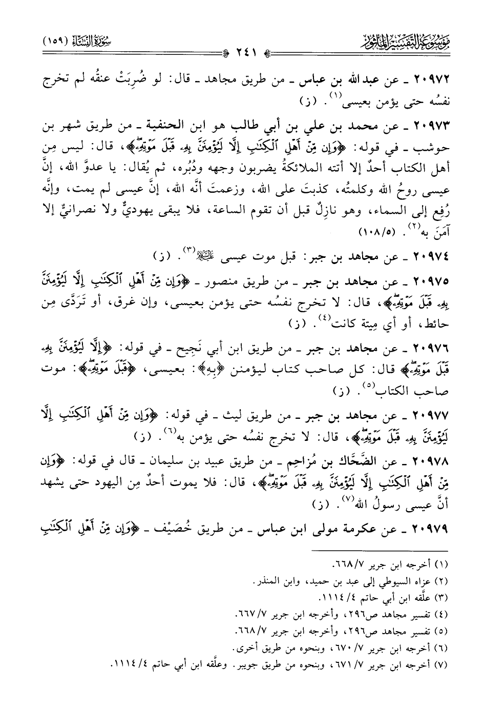٢٠٩٧٥ - عن مجاهد بن جبر -من طريق منصور- {وإن من أهل الكتاب إلا ليؤمنن به قبل موته}، قال: لا تخرج نفسُه حتى يؤمن بعيسى، وإن غرق، أو تَرَدّى مِن حائط، أو أي مِيتة كانت (¬٤). (ز)