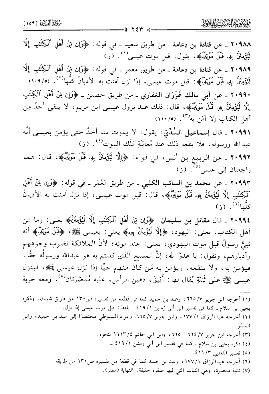 ٢٠٩٩٠ - عن أبي مالك غَزْوان الغفاري -من طريق حصين- {وإن من أهل الكتاب إلا ليؤمنن به قبل موته}، قال: ذلك عند نزول عيسى ابن مريم، لا يبقى أحدٌ مِن أهل الكتاب إلا آمَن به (¬٣). (٥/ ١١٠)