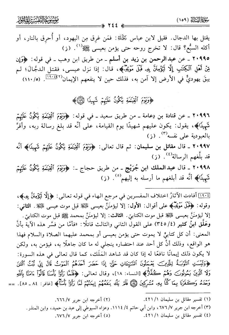 [١٩٠٤] أفادت الآثارُ اختلاف المفسرين في مرجع الهاء في قوله تعالى: {إلا لَيَؤُمِنَنَّ بِهِ}، وقوله: {قَبْلَ مَوْتِهِ} على أقوال: الأول: إلا ليؤمنَنَّ بعيسى - عليه السلام - قبل موت عيسى - عليه السلام -. الثاني: إلا ليؤمنَنَّ بعيسى - عليه السلام - قبل موت الكتابيّ. الثالث: إلا ليؤمنَنَّ بمحمد - صلى الله عليه وسلم - قبل موت الكتابيّ.