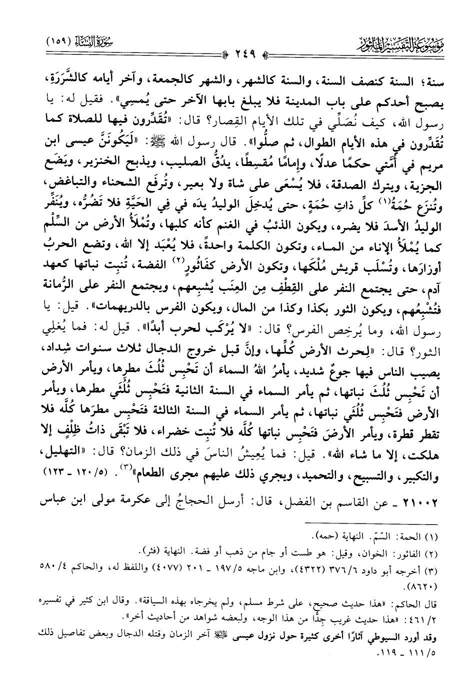 سنة؛ السنة كنصف السنة، والسنة كالشهر، والشهر كالجمعة، وآخر أيامه كالشَّرَرَةِ، يصبح أحدكم على باب المدينة فلا يبلغ بابها الآخر حتى يُمسِي». فقيل له: يا رسول الله، كيف نُصَلِّي في تلك الأيام القِصار؟ قال: «تُقَدِّرون فيها للصلاة كما تُقَدِّرون في هذه الأيام الطوال، ثم صلُّوا». قال رسول الله - صلى الله عليه وسلم -: «لَيَكُونَنَّ عيسى ابن مريم في أُمَّتي حكمًا عدلًا، وإمامًا مُقسِطًا، يدُقُّ الصليب، ويذبح الخنزير، ويَضَع الجزية، ويترك الصدقة، فلا يُسْعى على شاة ولا بعير، وتُرفَع الشحناء والتباغض، وتُنزَع حُمَةُ (¬١) كلِّ ذاتِ حُمَةٍ، حتى يُدخِلَ الوليدُ يدَه في فِي الحَيَّةِ فلا تَضُرُّه، ويُنَفِّر الوليدُ الأسدَ فلا يضره، ويكون الذئبُ في الغنم كأنه كلبها، وتُمْلَأُ الأرض من السِّلْم كما يُمْلَأُ الإناء من الماء، وتكون الكلمة واحدةً، فلا يُعْبَد إلا الله، وتضع الحربُ أوزارَها، وتُسْلَب قريش مُلْكَها، وتكون الأرض كفاثُورٍ (¬٢) الفضة، تُنبِت نباتها كعهد آدم، حتى يجتمع النفر على القِطْفِ مِن العِنَب يُشبِعهم، ويجتمع النفر على الرُّمانة فتُشْبِعُهم، ويكون الثور بكذا وكذا من المال، ويكون الفرس بالدريهمات». قيل: يا رسول الله، وما يُرخِص الفرس؟ قال: «لا يُرْكَب لحرب أبدًا». قيل له: فما يُغلِي الثور؟ قال: «لِحرث الأرض كُلِّها، وإنّ قبل خروج الدجال ثلاث سنوات شِداد، يصيب الناس فيها جوعٌ شديد، يأمرُ اللهُ السماءَ أن تَحْبِس ثُلُثَ مطرِها، ويأمر الأرض أن تَحْبِس ثُلُثَ نباتها، ثم يأمر السماء في السنة الثانية فتَحْبِس ثُلُثَي مطرها، ويأمر الأرض فتَحْبِس ثُلُثَي نباتها، ثم يأمر السماء في السنة الثالثة فتَحْبِس مطرَها كُلَّه فلا تقطر قطرة، ويأمر الأرضَ فتَحْبِس نباتها كُلَّه فلا تُنبِت خضراء، فلا تَبْقى ذاتُ ظِلْفٍ إلا هلكت، إلا ما شاء الله». قيل: فما يُعِيشُ الناسَ في ذلك الزمان؟ قال: «التهليل، والتكبير، والتسبيح، والتحميد، ويجري ذلك عليهم مجرى الطعام» (¬٣). (٥/ ١٢٠ - ١٢٣)