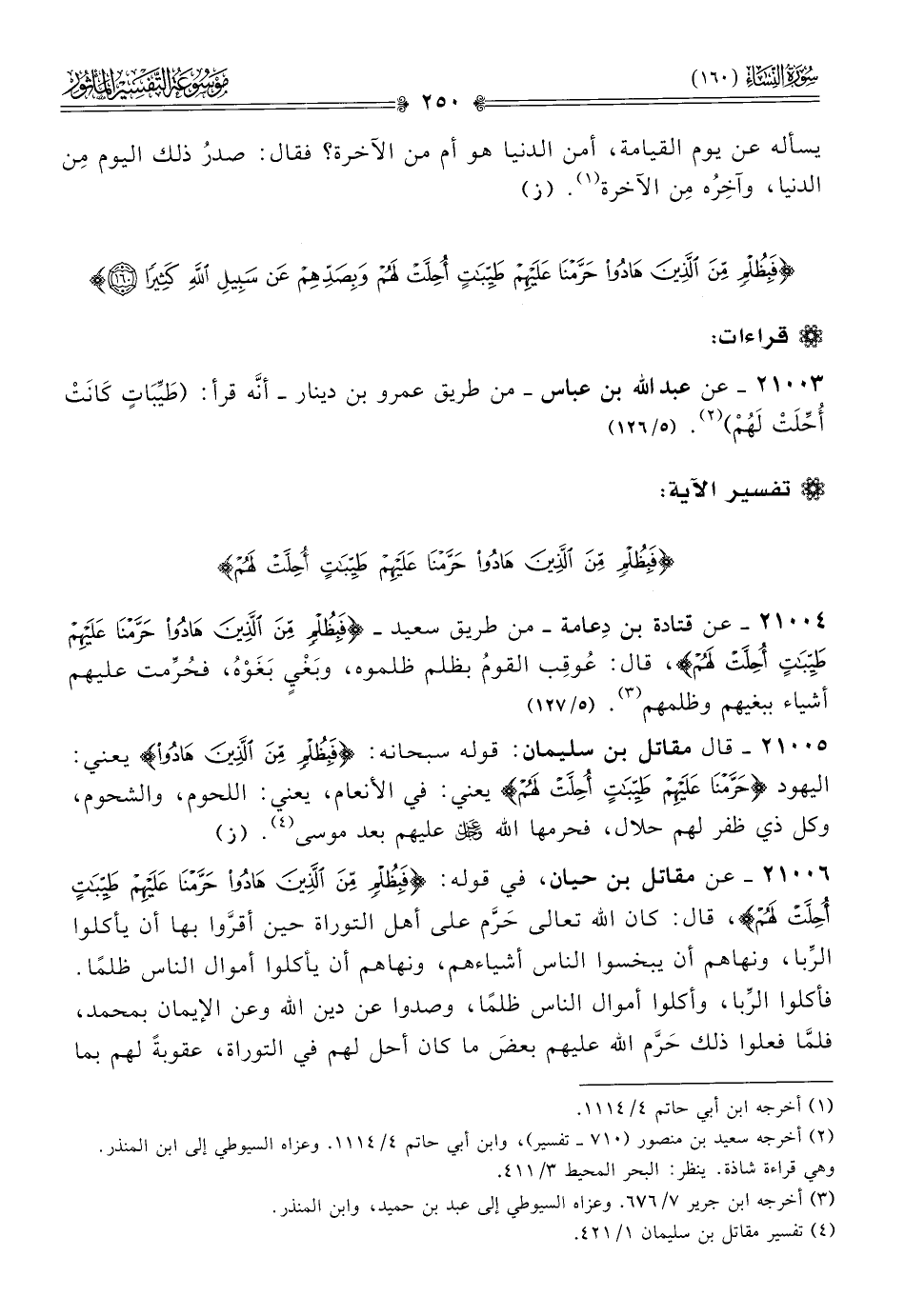 ٢١٠٠٦ - عن مقاتل بن حيان، في قوله: {فبظلم من الذين هادوا حرمنا عليهم طيبات أحلت لهم}، قال: كان الله تعالى حَرَّم على أهل التوراة حين أقرَّوا بها أن يأكلوا الرِّبا، ونهاهم أن يبخسوا الناس أشياءهم، ونهاهم أن يأكلوا أموال الناس ظلمًا. فأكلوا الرِّبا، وأكلوا أموال الناس ظلمًا، وصدوا عن دين الله وعن الإيمان بمحمد، فلمّا فعلوا ذلك حَرَّم الله عليهم بعضَ ما كان أحل لهم في التوراة، عقوبةً لهم بما