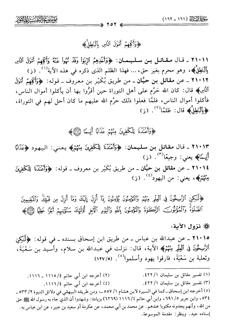 ٢١٠١٢ - عن مقاتل بن حيّان -من طريق بُكَيْر بن معروف- قوله: {وأكلهم أموال الناس} قال: كان الله حَرَّم على أهل التوراة حين أقرُّوا بها أن يأكلوا أموال الناس، فأكلوا أموال الناس، فلمّا فعلوا ذلك حرَّم الله عليهم ما كان أحل لهم في التوراة، {بالباطل} قال: ظلمًا (¬٢). (ز)