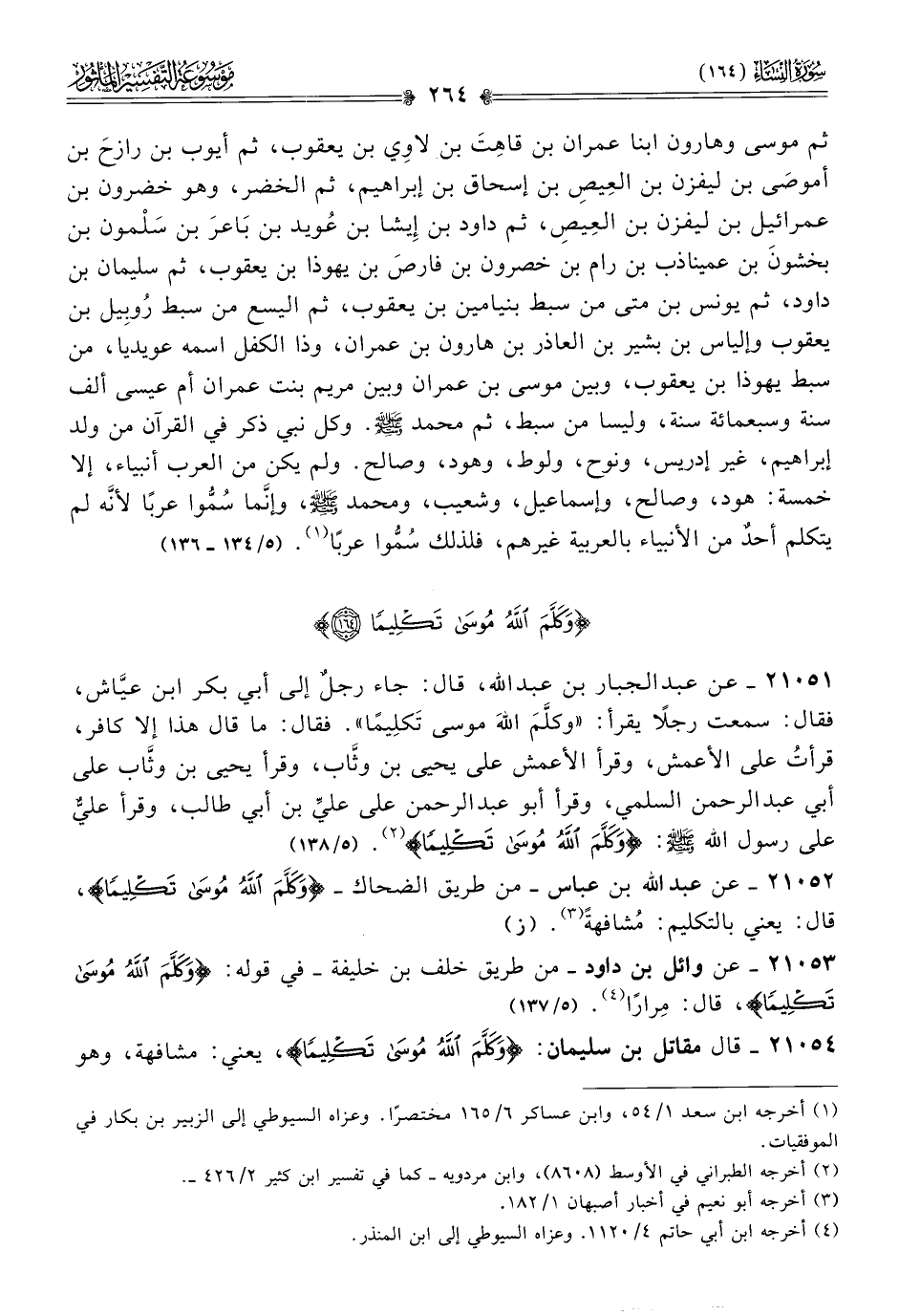 ٢١٠٥٣ - عن وائل بن داود -من طريق خلف بن خليفة- في قوله: {وكلم الله موسى تكليما}، قال: مِرارًا (¬٤). (٥/ ١٣٧)