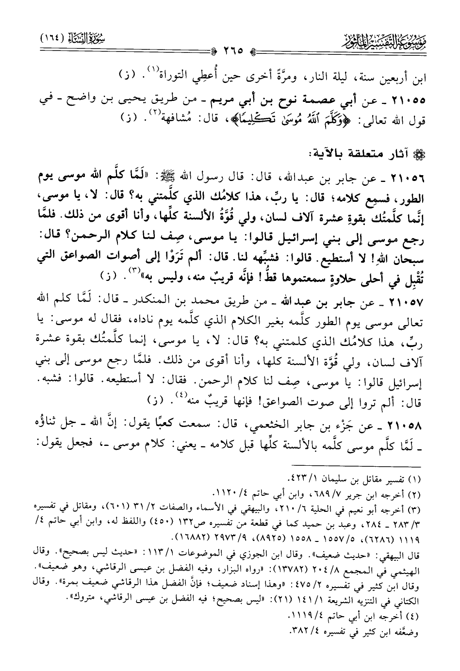 ٢١٠٥٥ - عن أبي عصمة نوح بن أبي مريم -من طريق يحيى بن واضح- في قول الله تعالى: {وكلم الله موسى تكليما}، قال: مُشافهة (¬٢). (ز)