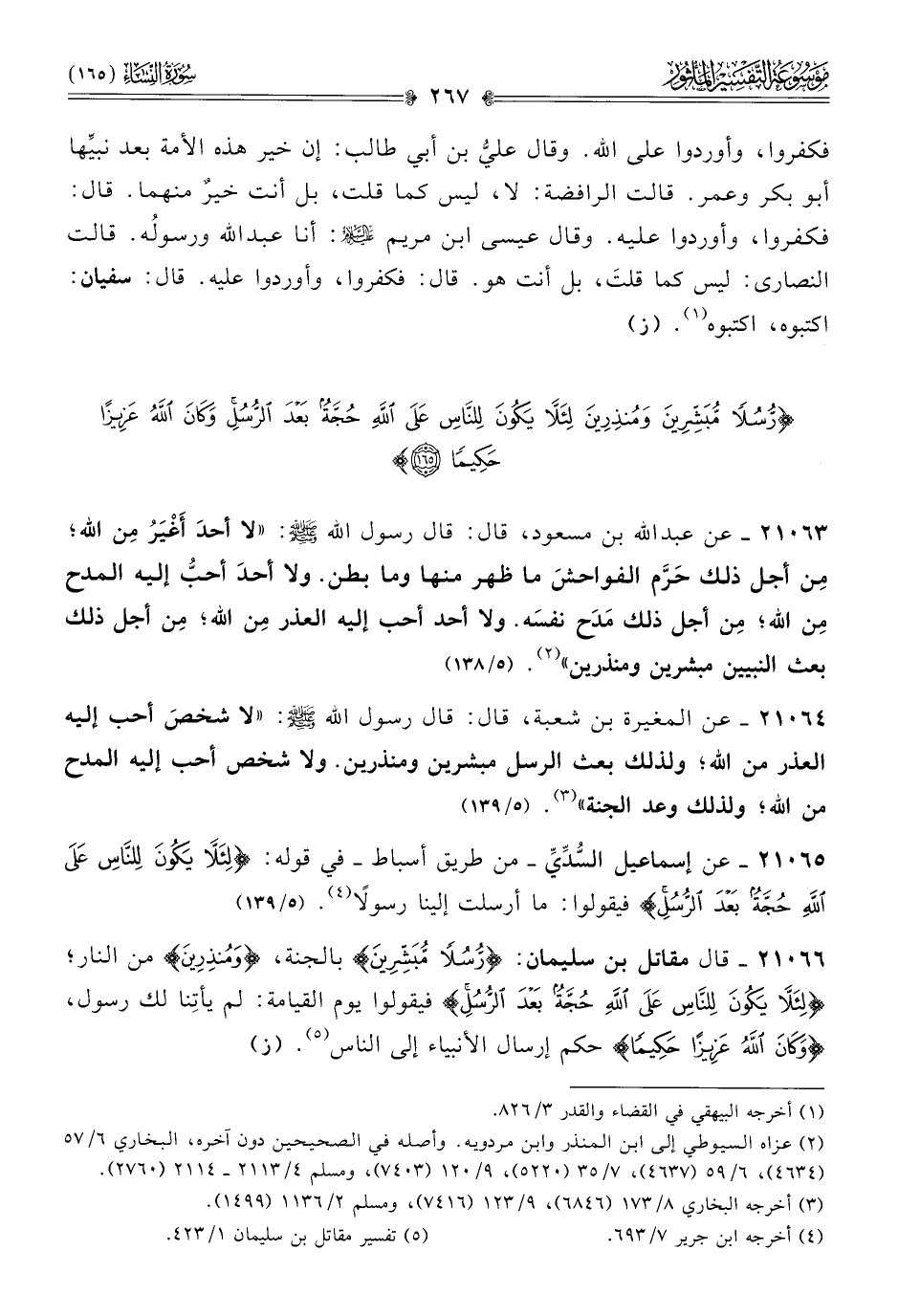 ٢١٠٦٥ - عن إسماعيل السُّدِّيِّ -من طريق أسباط- في قوله: {لئلا يكون للناس على الله حجة بعد الرسل} فيقولوا: ما أرسلت إلينا رسولا (¬٤). (٥/ ١٣٩)