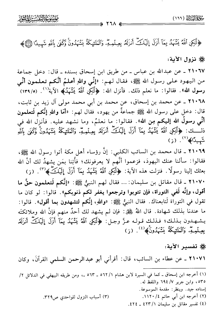 ٢١٠٦٧ - عن عبد الله بن عباس -من طريق ابن إسحاق بسنده- قال: دخل جماعة من اليهود على رسول الله - صلى الله عليه وسلم -، فقال لهم: «إنِّي واللهِ أعلمُ أنّكم تعلمون أنِّي رسول الله». فقالوا: ما نعلم ذلك. فأنزل الله: {لكن الله يشهد} الآية (¬١). (٥/ ١٣٩)
