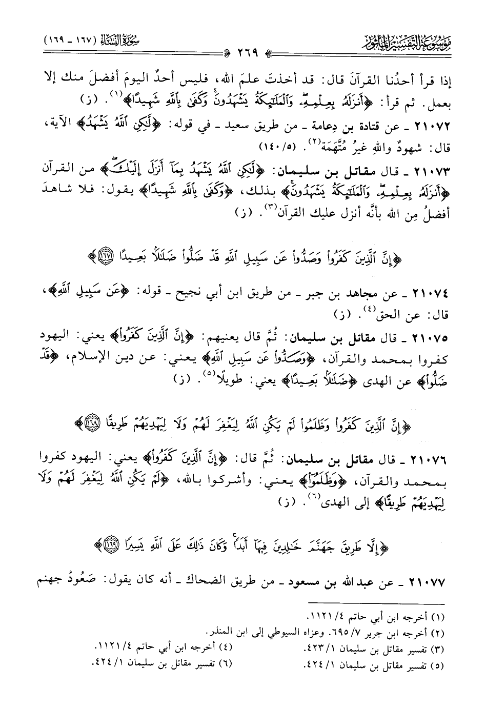 ٢١٠٧٦ - قال مقاتل بن سليمان: ثُمَّ قال: {إن الذين كفروا} يعني: اليهود كفروا بمحمد والقرآن، {وظلموا} يعني: وأشركوا بالله، {لم يكن الله ليغفر لهم ولا ليهديهم طريقا} إلى الهدى (¬٦). (ز)