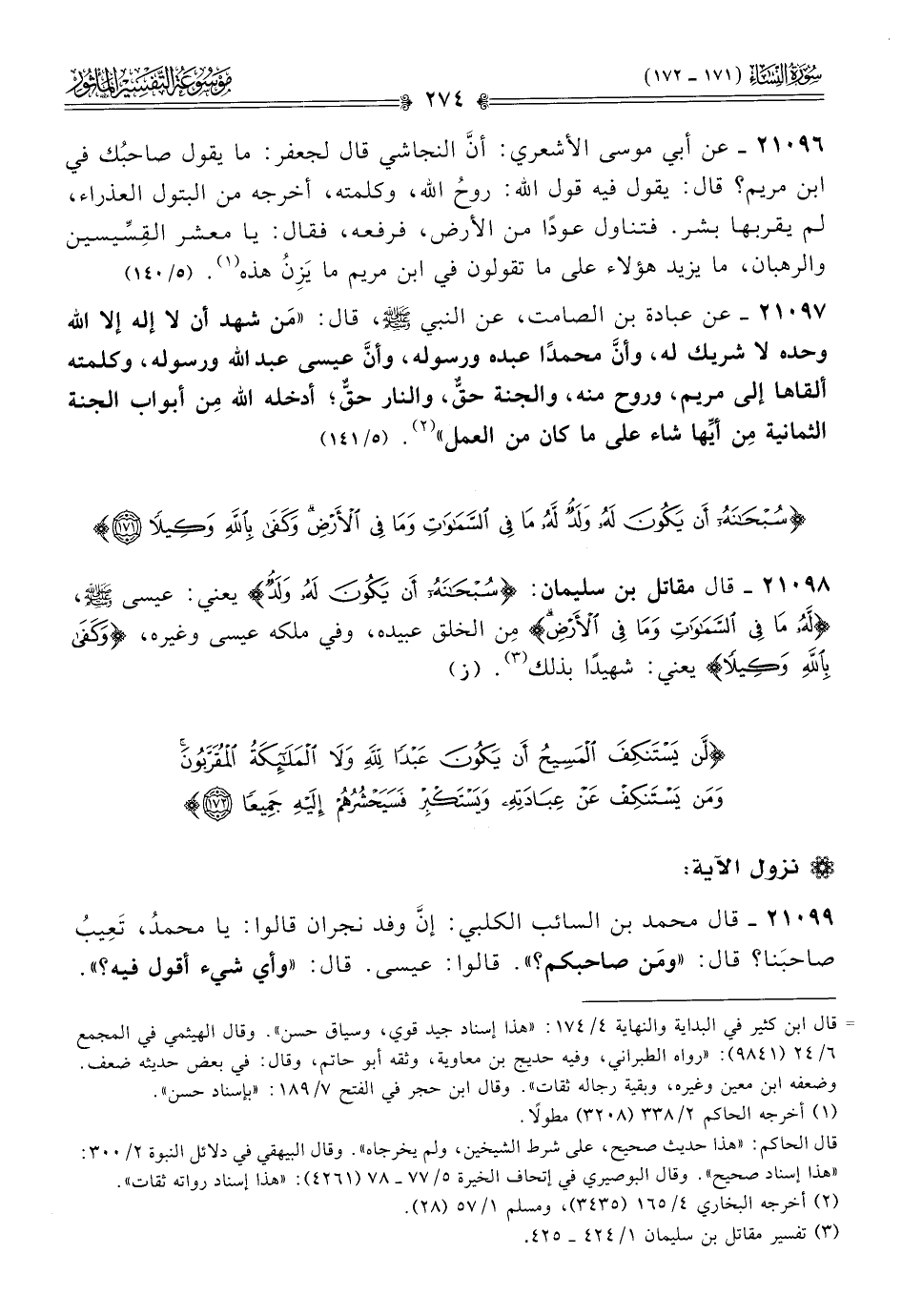 ٢١٠٩٩ - قال محمد بن السائب الكلبي: إنّ وفد نجران قالوا: يا محمدُ، تَعِيبُ صاحبَنا؟ قال: «ومَن صاحبكم؟». قالوا: عيسى. قال: «وأي شئ أقول فيه؟».