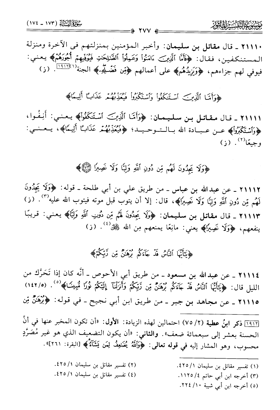 ٢١١١٠ - قال مقاتل بن سليمان: وأخبر المؤمنين بمنزلتهم فى الآخرة ومنزلة المستنكفين، فقال: {فأما الذين آمنوا وعملوا الصالحات فيوفيهم أجورهم} يعني: فيوفي لهم جزاءهم، {ويزيدهم} على أعمالهم {من فضله} الجنة (¬١) [١٩١٢]. (ز)