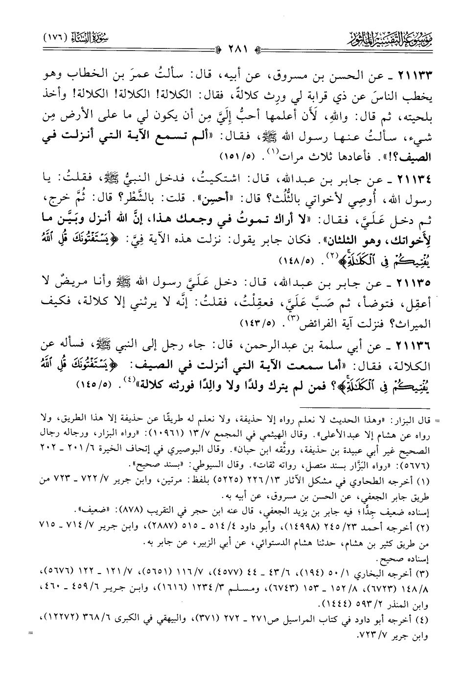 ٢١١٣٤ - عن جابر بن عبد الله، قال: اشتكيتُ، فدخل النبي - صلى الله عليه وسلم -، فقلتُ: يا رسول الله، أُوصِي لأخواتي بالثُّلُث؟ قال: «أحسِن». قلت: بالشَّطْر؟ قال: ثُمَّ خرج، ثم دخل عَلَيَّ، فقال: «لا أراك تموتُ في وجعك هذا، إنّ الله أنزل وبَيَّن ما لِأَخواتك، وهو الثلثان». فكان جابر يقول: نزلت هذه الآية فِيَّ: {يستفتونك قل الله يفتيكم في الكلالة} (¬٢).