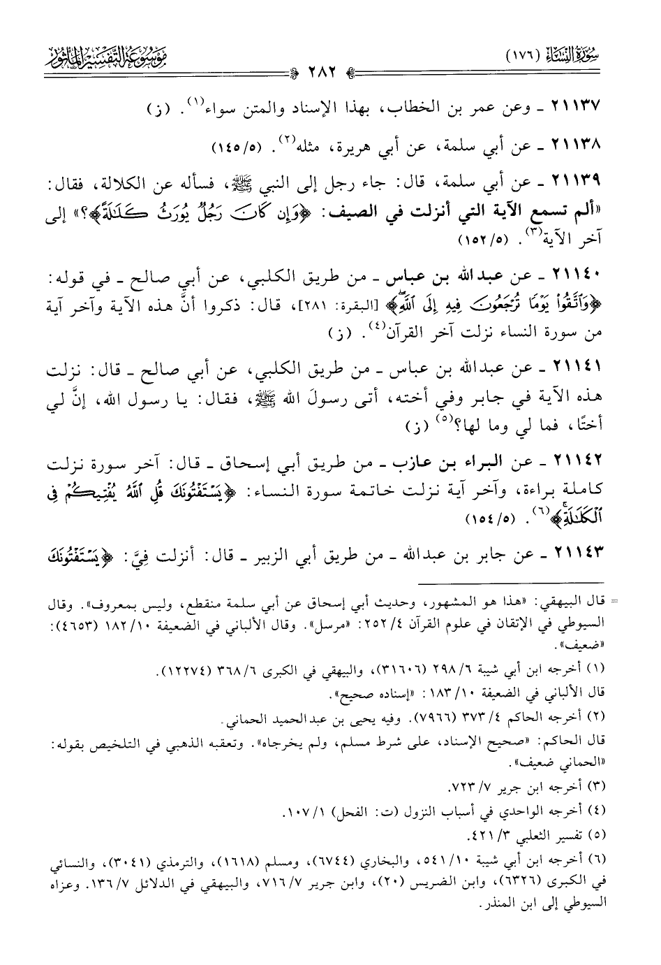 ٢١١٤٢ - عن البراء بن عازب -من طريق أبي إسحاق- قال: آخر سورة نزلت كاملة براءة، وآخر آية نزلت خاتمة سورة النساء: {يستفتونك قل الله يفتيكم في الكلالة} (¬٦). (٥/ ١٥٤)