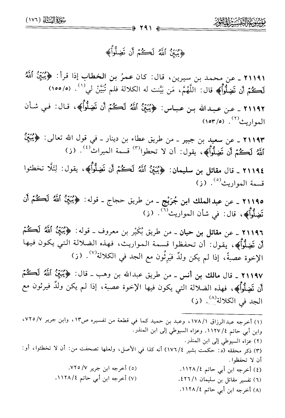 ٢١١٩٢ - عن عبد الله بن عباس: {يبين الله لكم أن تضلوا}، قال: في شأن المواريث (¬٢). (٥/ ١٥٣)